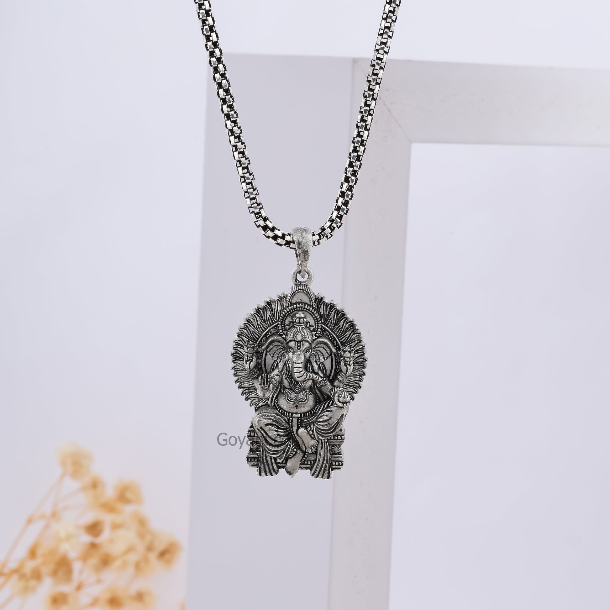 Description: Experience the regal presence of Lord Ganesh with our 925 Silver Ganeshji in Singhasan Pendant, a majestic emblem of wisdom, prosperity, and divine grace. Crafted with meticulous detail and reverence, this pendant serves as a tangible symbol of devotion and spiritual connection.